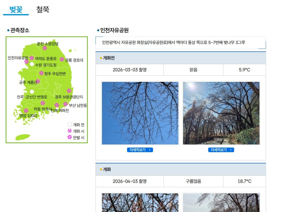 가려고 하는 동네에 벚꽃이 피었는지 확인하는 방법으로는 기상청이 있습니다